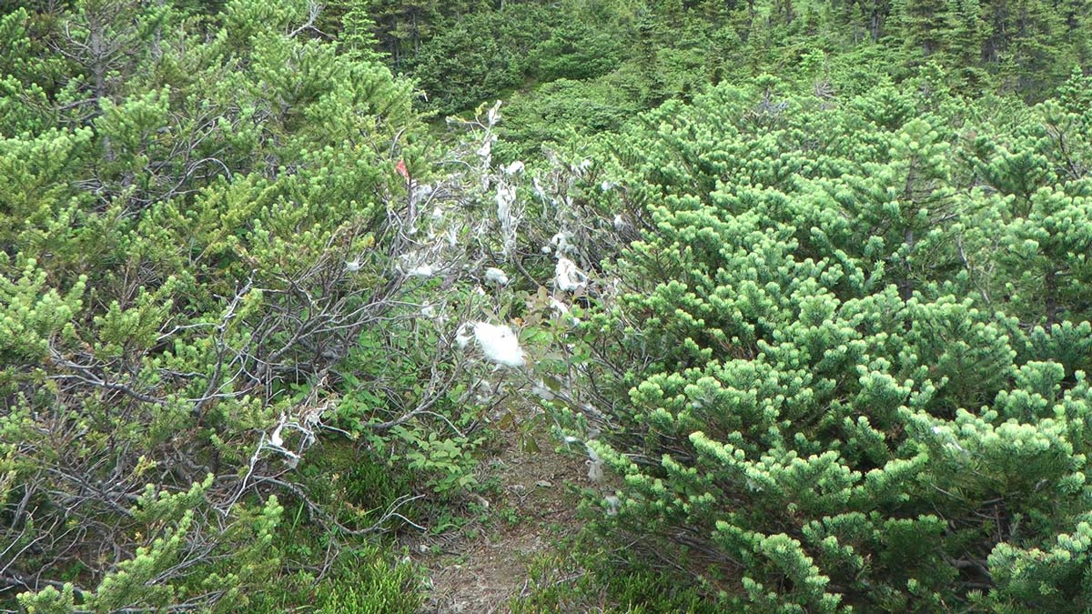 In summer, mountain goats shed their winter coat and leave clumps of hair hanging on the lower limbs of trees and brush where they walk. For centuries, First Nations have harvested the shed hair for use in clothing and ritual objects. First Nations also hunted goats for food or to use parts for domestic implements or clothing.